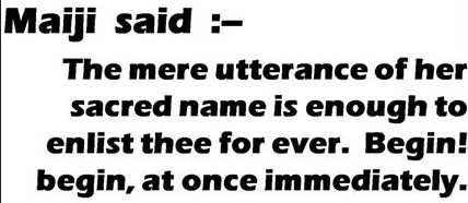 In a word the age of ceremony which has come down to us from centuries past had been the creation of ancient age when the simple pure religions and virtuous world had nothing like disbelief or absence of leisure or the difficulty of finding sufficient money etc. In fact that was the time when people wanted something that would keep them fully engaged in religious activities and thinking. Our present age is just the reverse and therefore it is natural that the occasions of such ceremonies have now degenerated into only merry-making with best dinners, dresses, social meetings, picnics. processions etc. Naturally enough, Mai-ism recognizes that an overhauling change is indispensable and the real purpose for which sacraments are meant should be revived in the most practical and efficacious fruit-bearing manner and to the extent that can be consistent with our modern life beset with worries, least leisure, faint belief, costliness of living, no great love between relations, long distances, foreign services etc. The question regarding the appropriateness of different Deities for different purposes etc. gets eliminated as soon as it is once fully realized that Mai is the Mother and origin of all incarnations and Deities. Rama. Krishna Shiva, Devi, Indra, Sun, Moon etc. All prostrations and prayers referred to Mai are most automatically accepted by the smaller entities as offered to themselves.