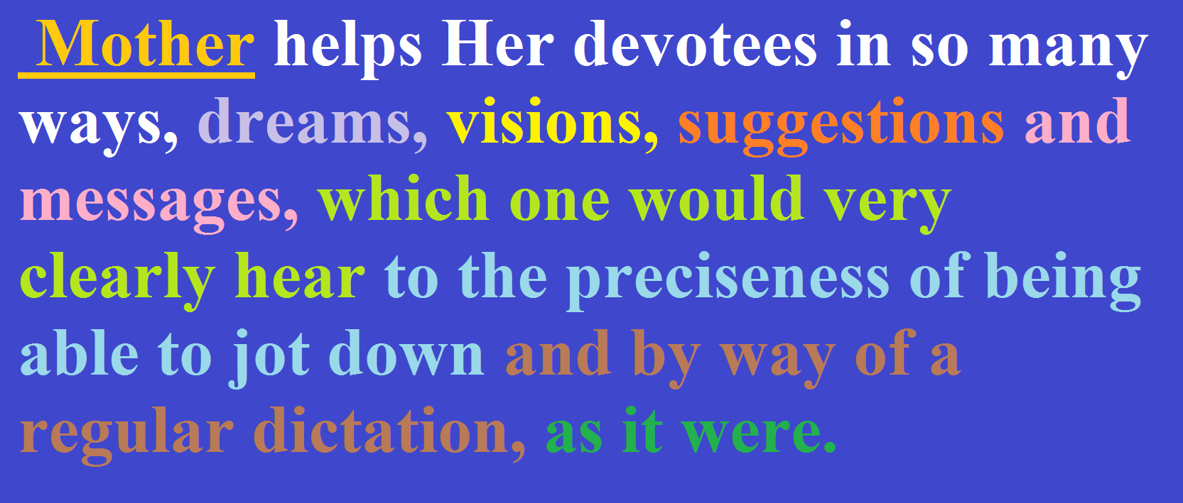 Once you have established relationship with Mother, it is your  choice to set up the standard for give and take or  postponement. Mother’s speed to your call will depend on the  intensity and impatience with which you offer your thanksgiving.  Mother accepts and adopts standard which you yourself lay  down.