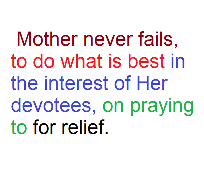 It is significant that all ceremonies performed for different purposes are eventually reduced to one most essential fact namely that in all cases we finally pray for the maximum grace of Mai. Therefore, Mother worship is fully adequate and efficacious. It is extremely evident that Mai fully knows for what purpose a particular celebration is being held and we need not resort to different methods, ceremonies and texts etc. for each case or separate occasion.