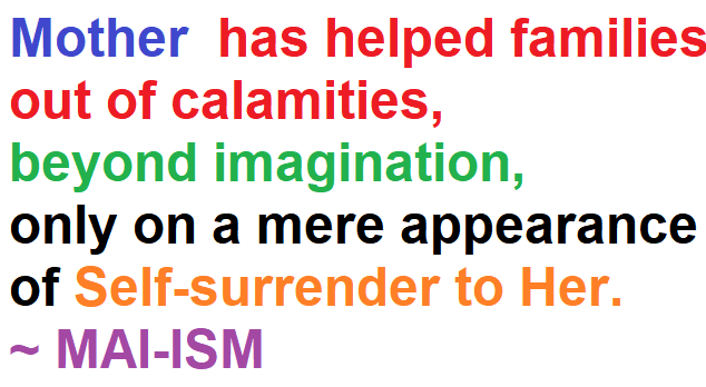 Mother Mai, with reference to a Kula or a family, on Mai being accepted and installed as the family goddess, that is surrendered to, worshipped, prostrated to, with names – repetitions, introspection, Guru- contact, etc., and on the preliminary advanced plane, specially propitiated through mutual worship* by husbands and wives in the family, and finally through a sexual un-contaminated mutual mental and heart worship, becomes Kuloddhaarini – the saviour of the family, in all aspects of misery – removals and happiness and grace – showers, of both, principally of this world, as also in other worlds, beyond and after this life.
