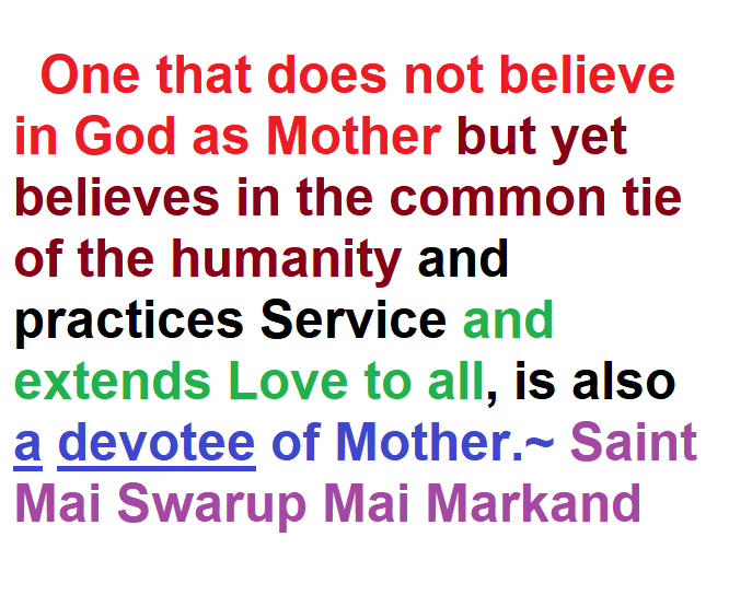 Mai-ism feels, the universe is changing from God’s one aspect to another. With an outright change, in the approach aspect of God, from fatherhood to motherhood, Mai-ism is sure about the gushing forth of the new creative tremendous forces, of new enthusiasm, ardor, zeal, vigor, and vitality, from the innermost hearts of really religious souls, who are at present paralyzed under the chaotic conditions of individual religions, with amplest justification for a general nausea against “religion”.